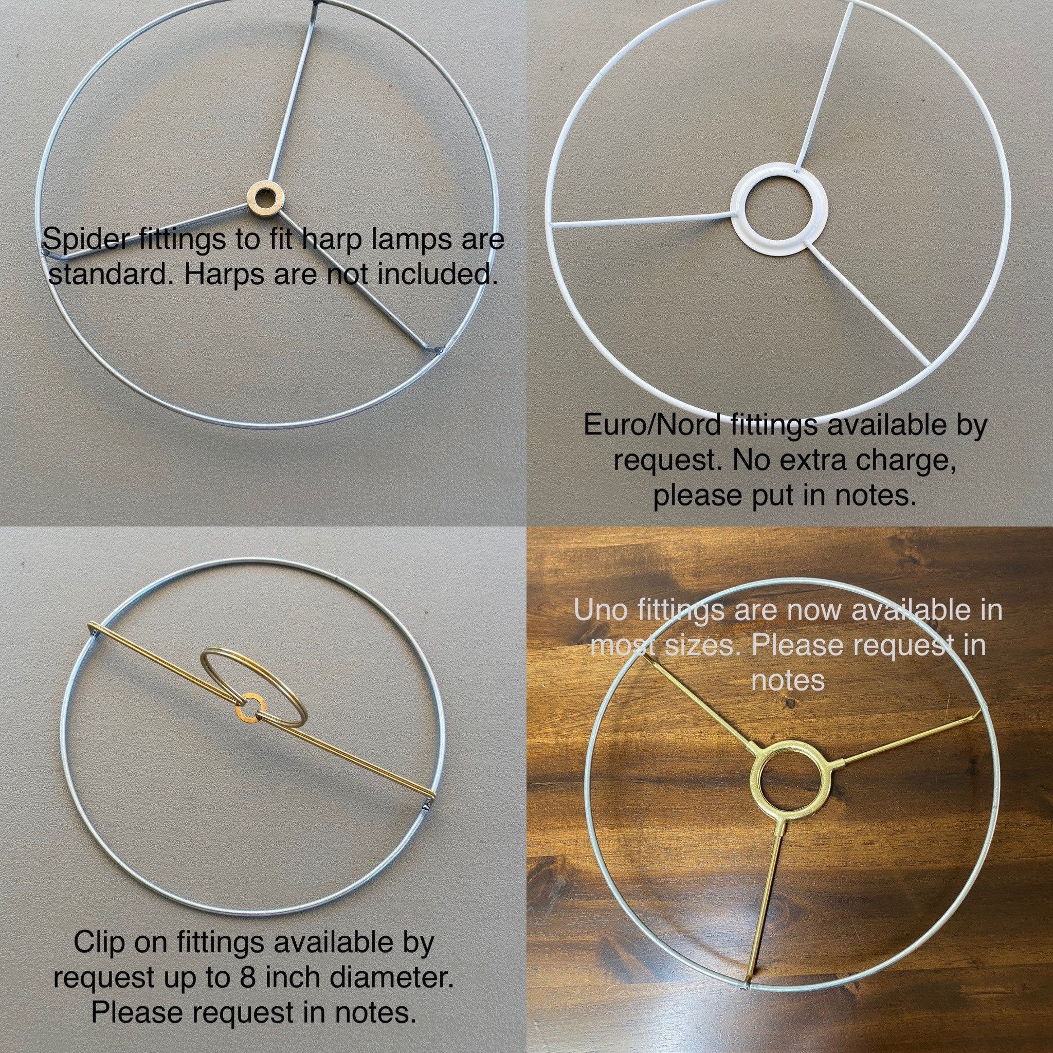 All lampshades are fitted with a standard nickel spider fitting with a 1/2 inch recess at the top. These fit most standard harp & finial lamp bases. I also offer euro, uno and clip on fittings, please either message me or request these specifically in a note with your order.